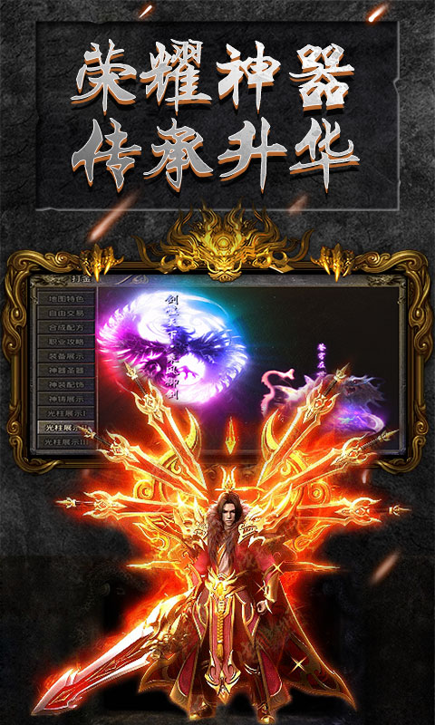 美术画面上,既在场景角色上忠于老传奇的复古风格,又在技能和道具特效上有所突破,武器套装的华丽,刀刀爆光柱的炫目,坐骑翅膀的绚丽,等着您来见证。